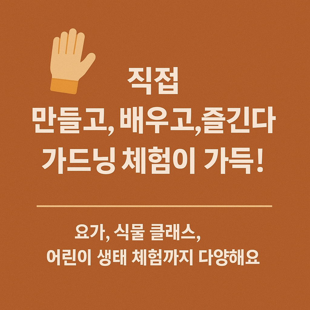 - 가드닝 클래스: 나만의 미니 정원 만들기, 플라워 바구니 조성, 식물표 만들기 등