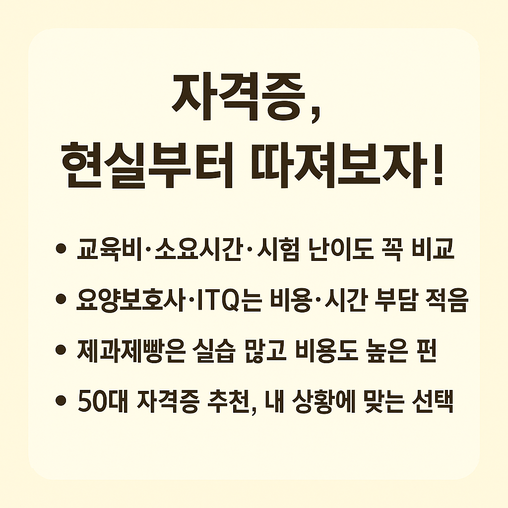 자격증을 선택할 때 가장 현실적으로 고민되는 부분은 단연 “얼마나 걸리고, 얼마 드는가?”입니다. 50대 자격증 추천에서 특히 중요하게 고려해야 할 요소는 교육비, 취득 기간, 학습 난이도, 그리고 향후 활용성입니다. 이를 기반으로 자신의 현재 상황에 맞는 자격증을 선택하는 것이 장기적으로 가장 효율적인 선택입니다.