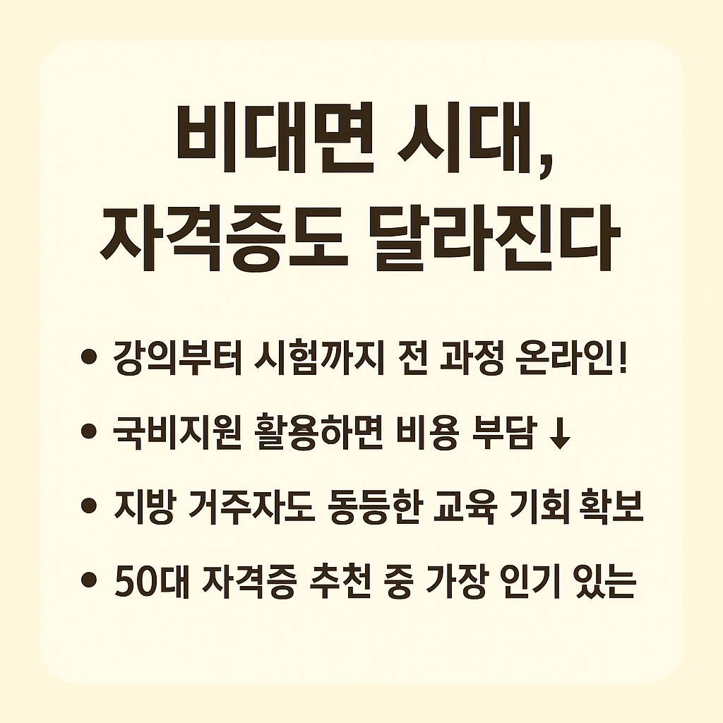 2025년 현재, 교육 방식의 가장 큰 변화는 단연코 비대면 온라인 학습의 일상화입니다. 특히 시간과 이동에 제약이 있는 50대 중장년층에게 온라인 기반 자격증 과정은 매우 매력적인 선택지입니다. 최근 교육 트렌드에 맞춰 다양한 민간 및 국가공인 자격증이 온라인 강의, 화상수업, 녹화 콘텐츠 등으로 제공되고 있습니다.
