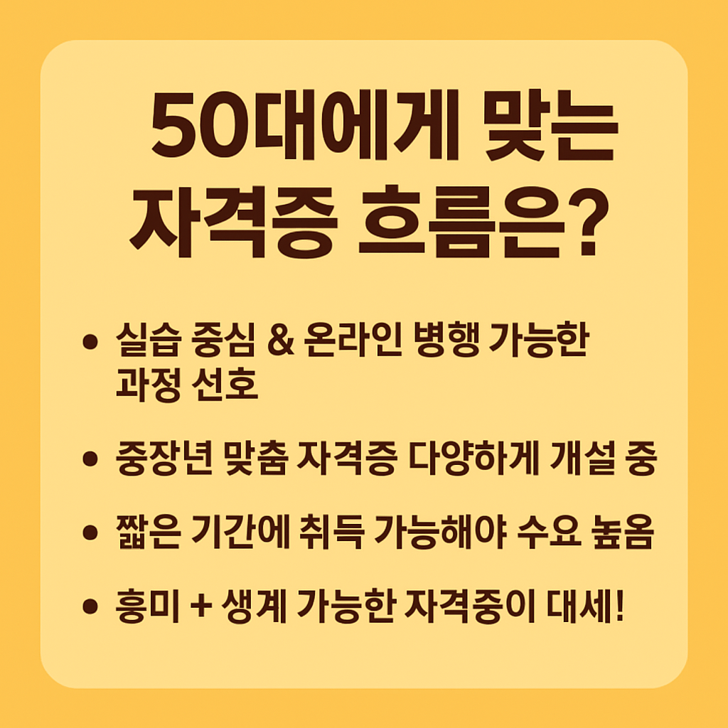 2025년은 변화의 해입니다. 디지털 전환, 고령화, 일·생활 균형이라는 흐름 속에서 50대는 더 이상 ‘은퇴의 세대’가 아닙니다. 이젠 새로운 가능성을 열어가는 ‘두 번째 출발선’에 선 세대입니다. 여러분의 삶을 더 넓고 풍요롭게 만들어 줄 자격증, 지금부터 차근차근 준비해보세요.