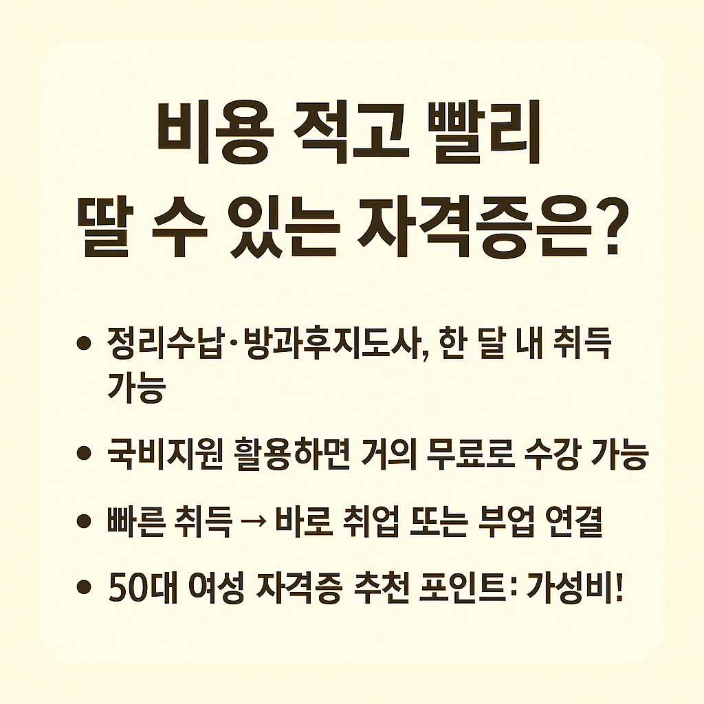 | ITQ / 컴활 | 약 5~15만 원 (자율 학습 가능) | 2주~1개월 | 중 | 공공기관, 사무직 재취업 |