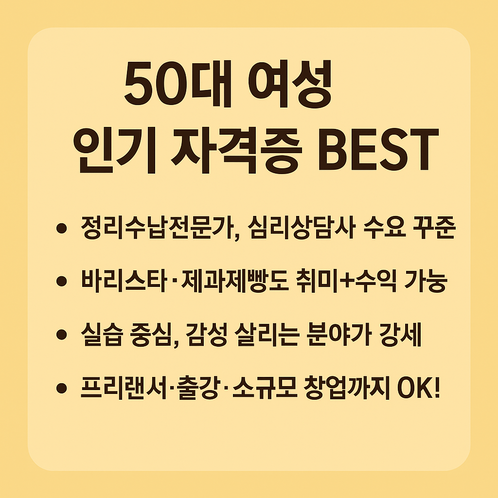 결론적으로, 50대 자격증 추천 중 여성들이 꾸준히 찾는 자격증들은 실생활과 밀접하고, 강사·창업·프리랜서 등 다양한 경로로 연결되는 유연한 자격이 많습니다. 지금의 흥미와 가능성을 바탕으로 자격증을 선택한다면, 자격 하나가 인생 후반의 중심축이 될 수 있습니다.