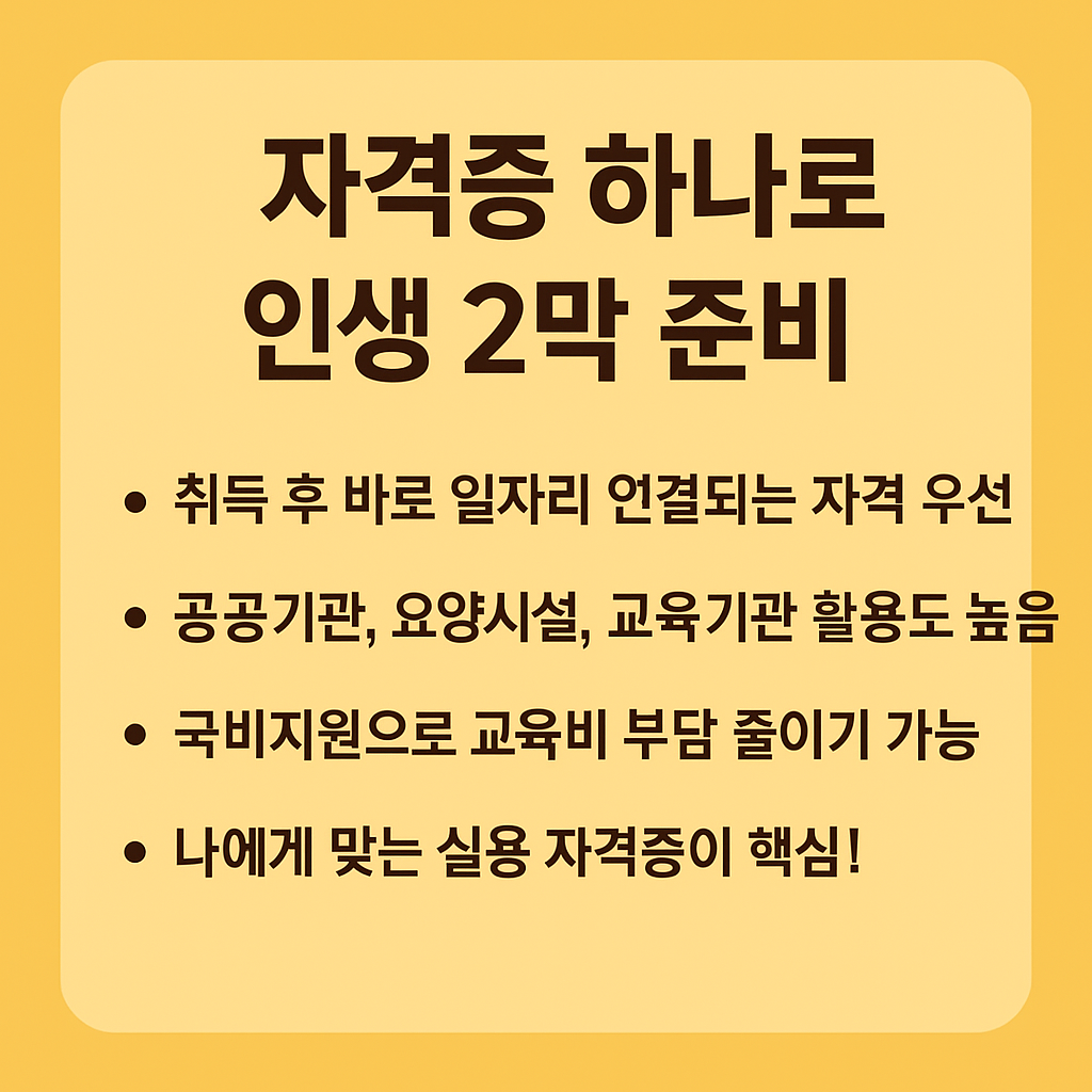 | 사회복지사 2급 | 6개월~1년 | 복지관, 요양시설 | 장기 취업 목표자 |