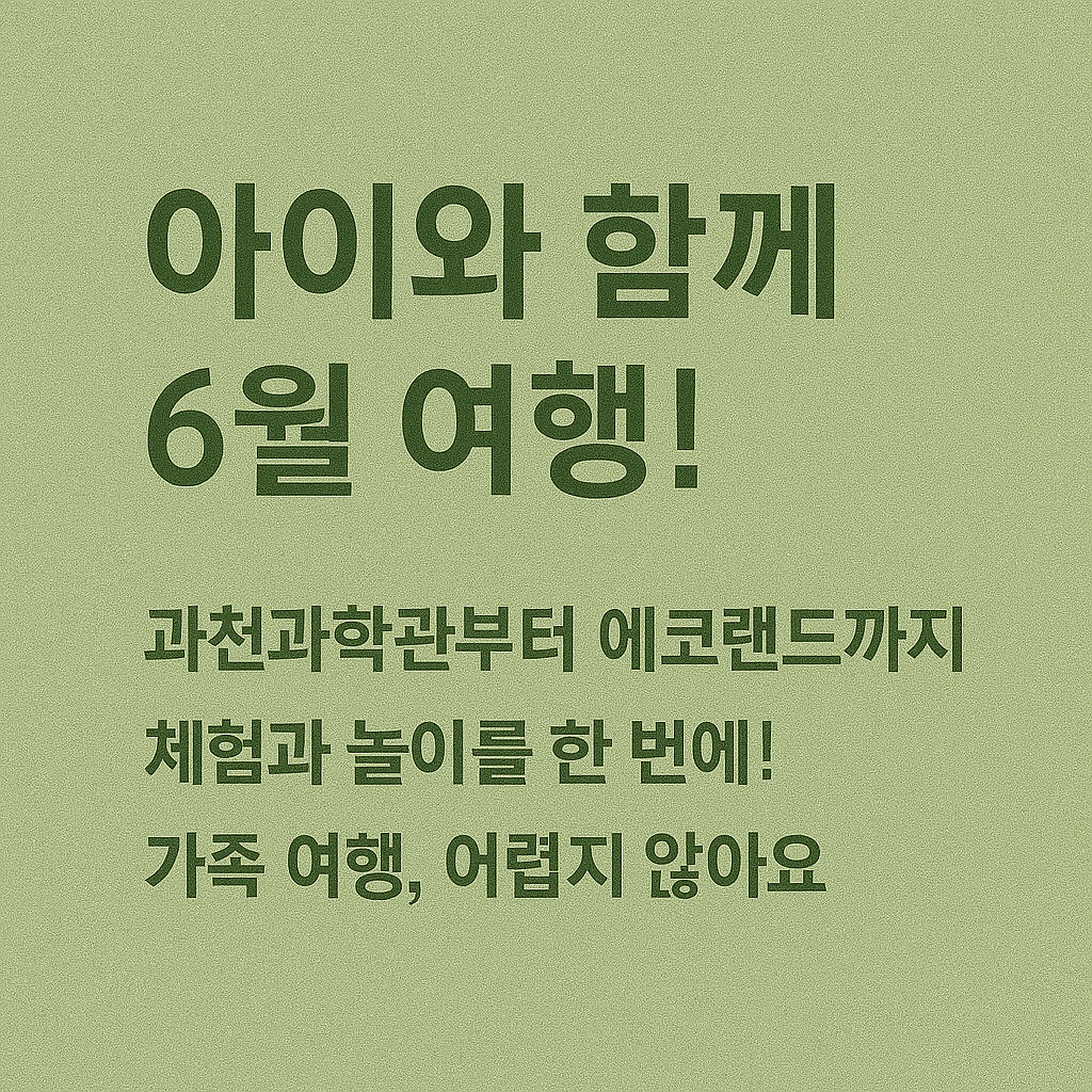 6월에 가볼 만한 국내 여행지는 단지 유명 관광지가 아닌, 아이들과 소중한 시간을 나눌 수 있는 체험과 추억 중심의 공간이어야 합니다. 안전하고 편안한 환경에서 배우고 느낄 수 있는 여행이야말로 아이에게는 평생 남을 소중한 선물이 됩니다.