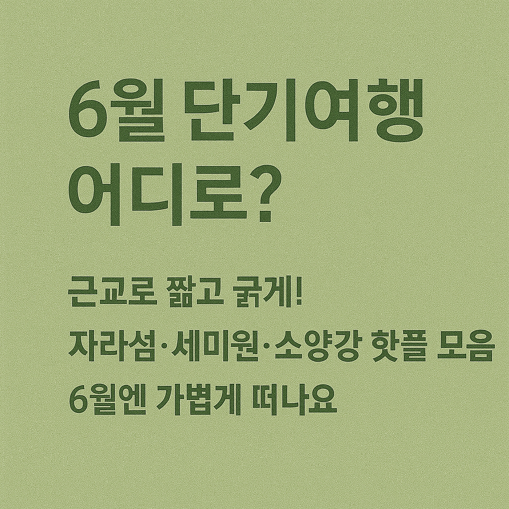 6월에 가볼 만한 국내 여행지 중 근교 여행은 바쁜 일상 속에서도 리프레시할 수 있는 좋은 선택지입니다. 짧은 거리지만 알찬 일정으로 구성하면 비행기나 고속열차 없이도 충분히 만족스러운 여행이 가능합니다.