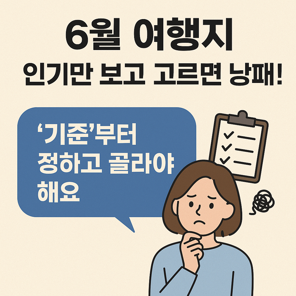 6월 해외여행지 추천은 단순히 유명한 곳이 아닌, 나의 일정, 예산, 목적에 맞춰 가장 잘 맞는 곳을 찾는 일입니다. 정보가 많다고 복잡해질 필요는 없습니다. 기후 → 거리 → 예산 → 활동성 → 안전 순으로 체크하면서 여행지 리스트를 좁혀나가면, 실패 없는 여행지를 고를 수 있습니다.