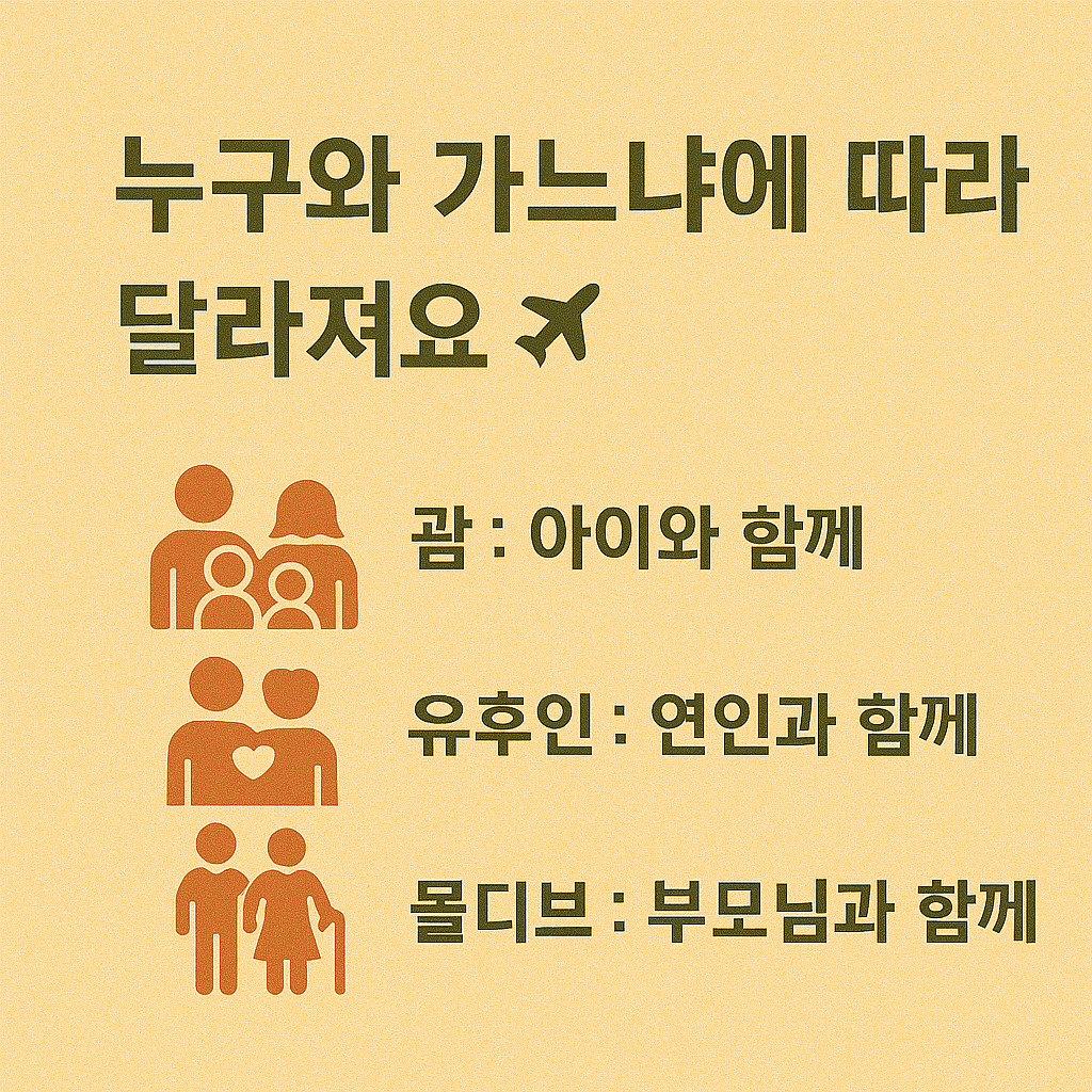 아래는 가족, 부모님, 신혼부부 각 상황별로 추천할 수 있는 주요 목적지와 특징을 정리한 것입니다. 항공 소요시간, 건강 상태, 액티비티 강도, 식사 환경 등을 기준으로 맞춤 제안을 드립니다.