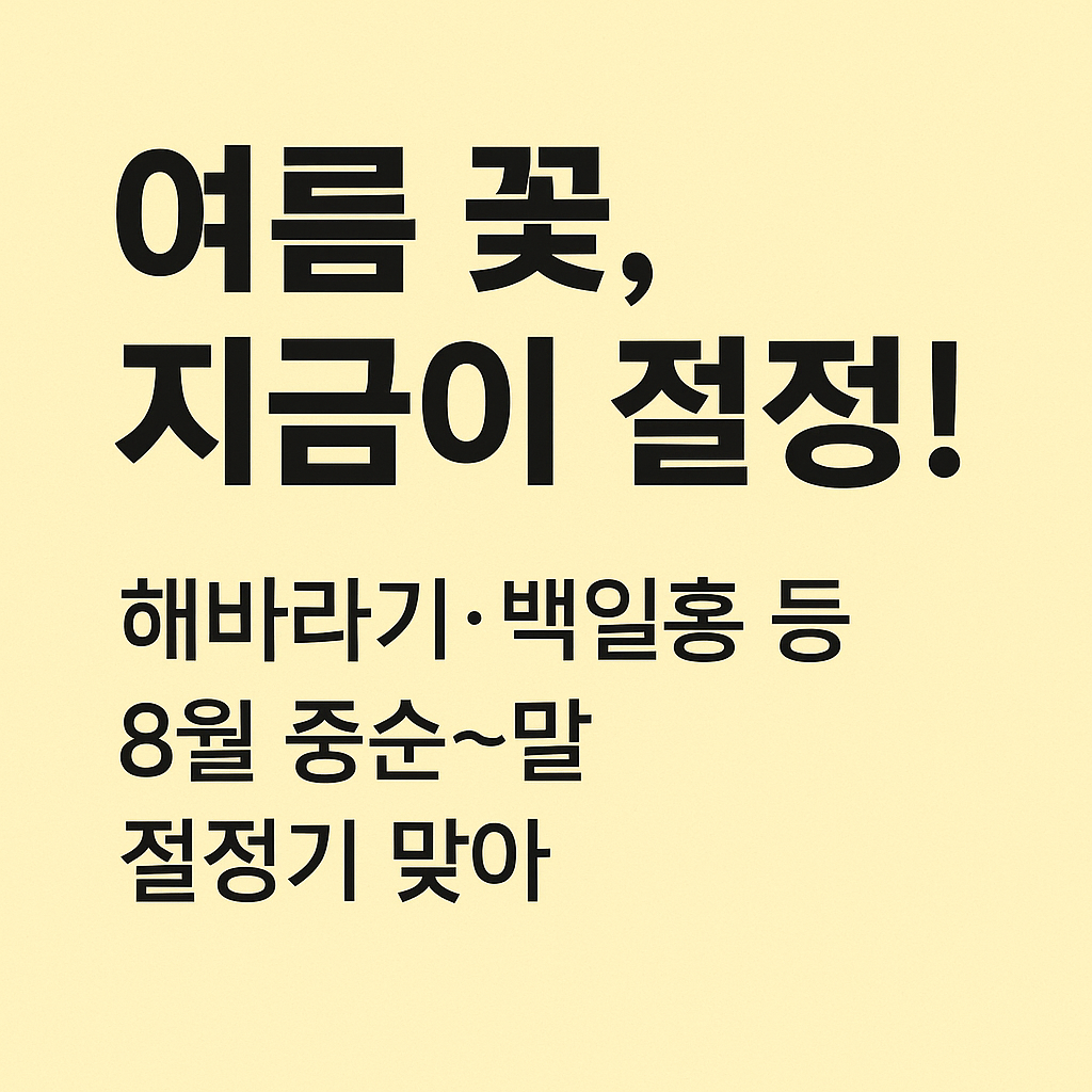 지금 이 계절이 아니면 만날 수 없는 풍경들이 여러분을 기다리고 있습니다. 꽃이 주는 위로와 자연이 주는 에너지를 마음껏 느끼며, 2025년 8월을 삶의 한 페이지로 아름답게 채워보세요.
