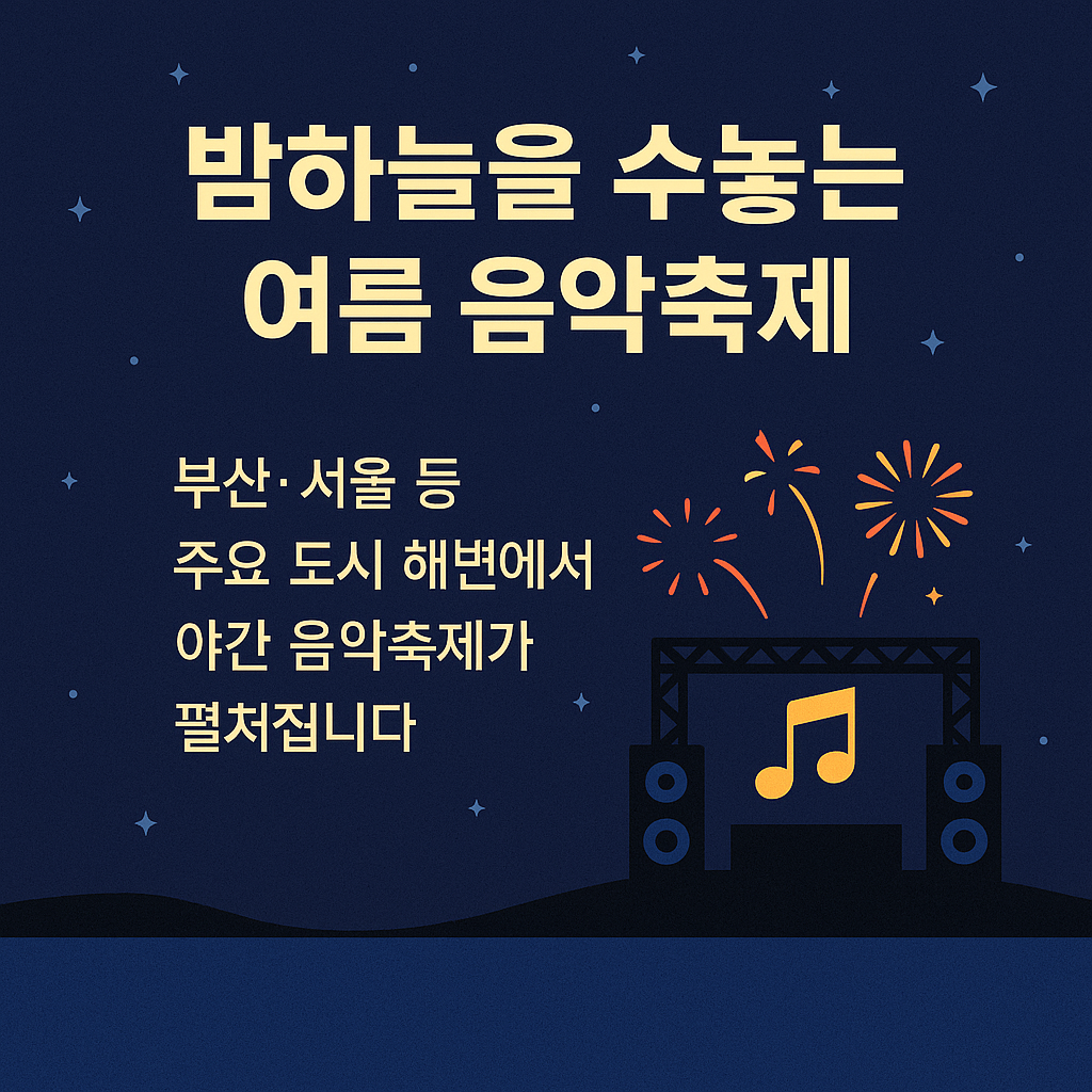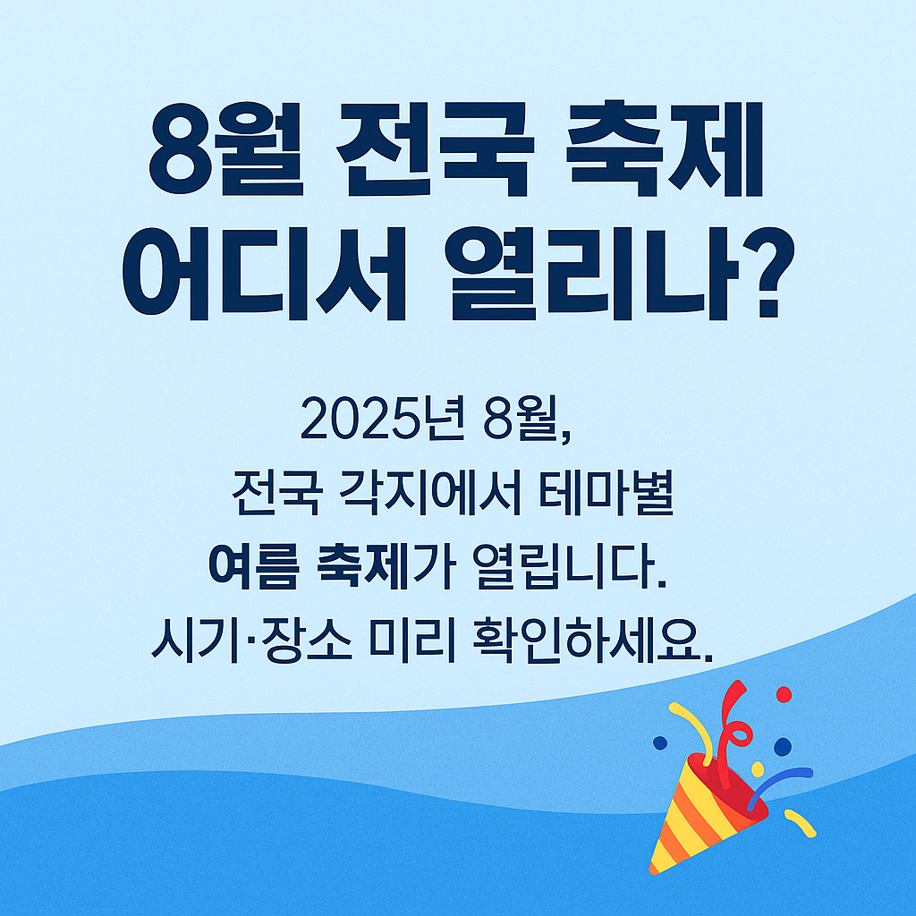 2025년 8월, 전국 곳곳에서 다채로운 8월 축제가 열립니다. 바다·계곡·도심 어디서든 음악, 불꽃, 문화, 먹거리를 즐길 수 있는 여름 축제 정보를 한눈에 정리했습니다.